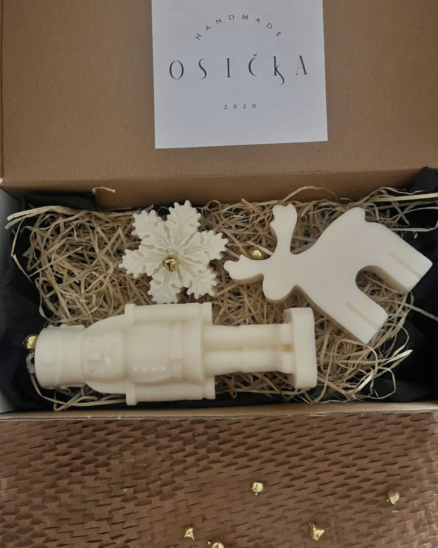 Vianočný box Vianočné kúzlo je odlievaný ručne zo 100% sójového vosku rastliného pôvodu. Kažďá sviečka má prírodný bavlnený knôt.