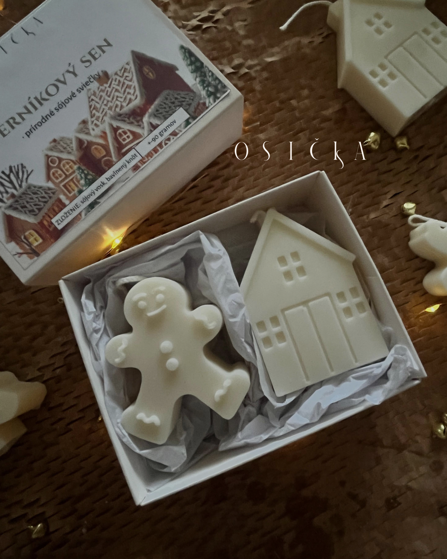 Vianočný box Perníkový sen je odlievaný ručne zo 100% sójového vosku rastliného pôvodu. Kažďá sviečka má prírodný bavlnený knôt.
